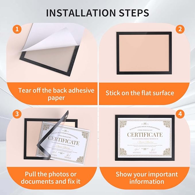 - Easy to Install & Replace: Open the magnetic sheet cover directly, put the 8.5in*11in pictures/documents you want to display, the cover closes automatically by magnetism, then stick the display frame to any flat surface, allowing quick insertion and exchange of the materials when you need to replace