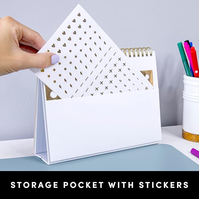 - SMALL DESK CALENDAR: Covering January 2025 - December 2025, this colorful monthly desktop calendar features a different vibrant color per month, three sticker sheets, a storage pocket, & spacious note pages for effortless planning.