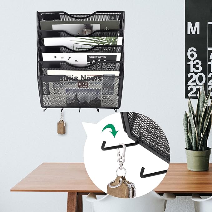 - One-Piece Design File Holder: 5 Filing pockets arranged vertically comes with mounting screws that can be easily mounted on the wall. Tag slot help you quickly identify what in the pocket. 5 hooks in the bottom can use to hold keys, handbag, umbrella, hat and clothes