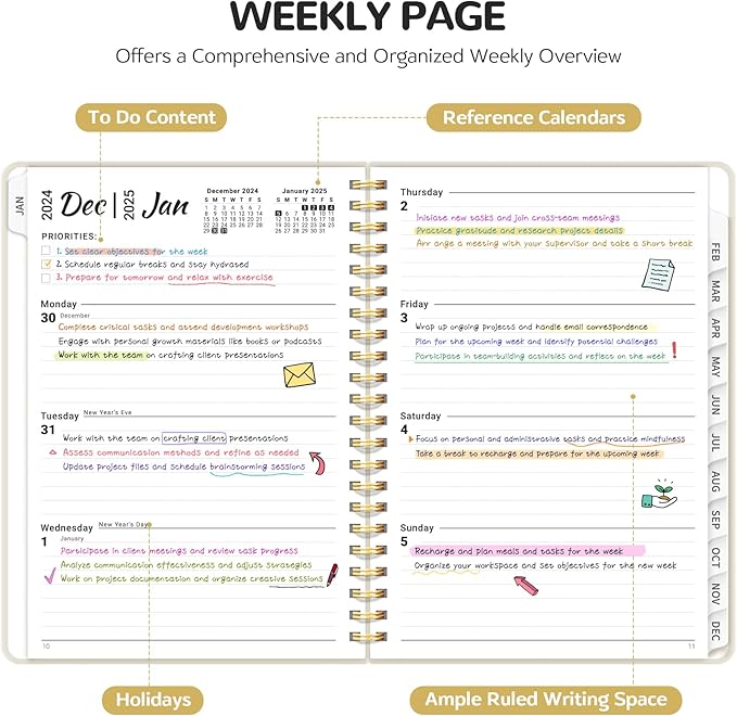 - Comprehensive Coverage: Our 2025 planner covers the entire year, from January to December, ensuring you're prepared for every month and week ahead. With 53 weeks included, you'll have plenty of room to plan, set goals, and track your progress toward success.