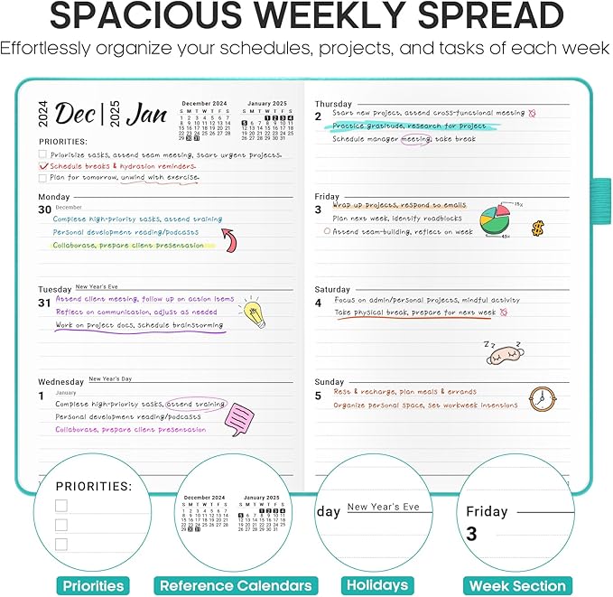 - Detailed Weekly Views: The weekly view pages offer plenty of space for daily schedules, appointments, and activities. Highlighted priority sections keep you focused on your most important goals. The weekly view pages help you organize and track your week efficiently, giving you a sense of accomplishment as you complete tasks.
