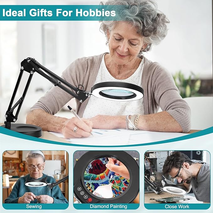 - 5 Color Modes & Brightness Stepless Dimming: The magnifying lamp offers 5 color temperature settings and brightness stepless dimming, with its built-in smart memory function automatically recalling your last lighting setup. This ensures consistent and personalized illumination every time you use it. Whether working on models, solving puzzles, reading newspapers, or reading books, this lamp provides the perfect lighting for all your needs.