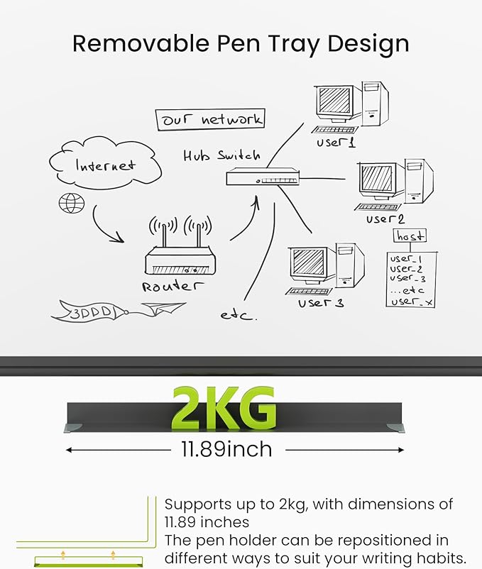 - Flexible Installation: Two installation options are available to cater to different needs. You can choose to mount on the horizontal or vertical installation. The removable pen slot can be adapted for two types of installation to meet various needs