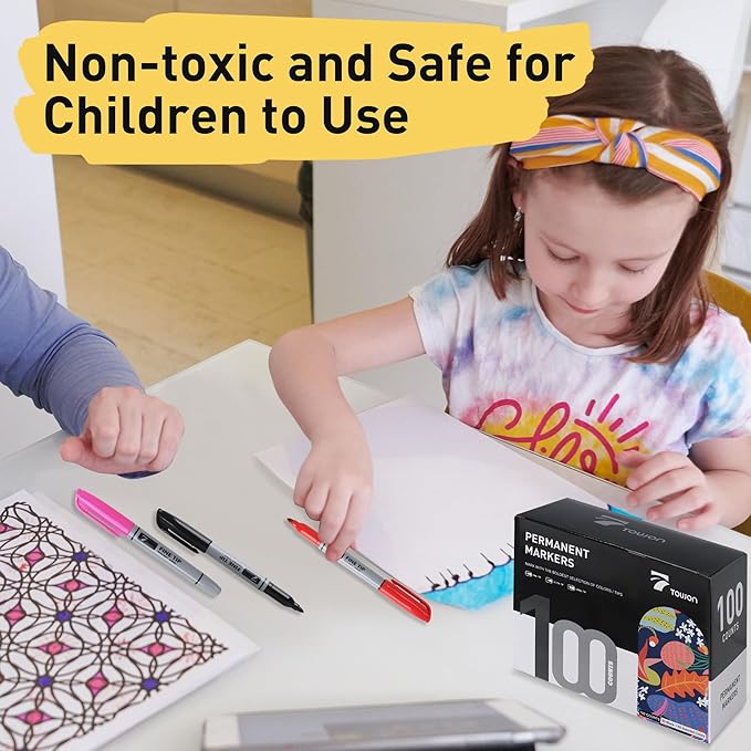 TOWON 100 Pack Permanent Markers Bulk - 50 Assorted Colors + 50 Black Waterproof Quick Drying Colored Pens Set for Classroom Home Office School Supplies, Adults Coloring Marking