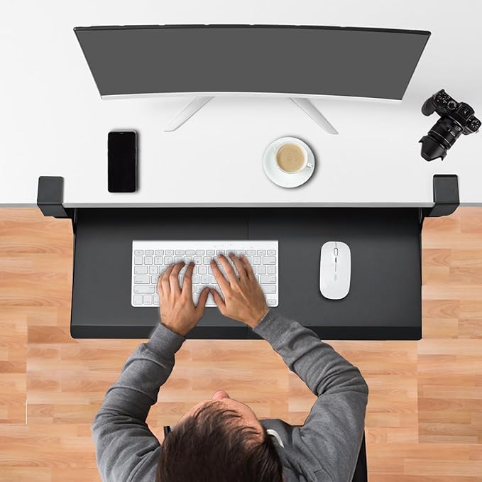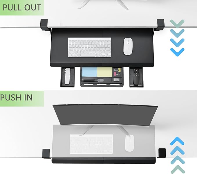 - Maximize Desk Space & 3 Drawers - The ETHU keyboard tray is designed to save desk space with its 26.77” (31.18" with clamps) x 12.2” size, allowing you to fit your keyboard, mouse, and small accessories beneath your desktop. Underneath the keyboard, 3 drawer storage adds valuable extra workspace for your phone and other items
