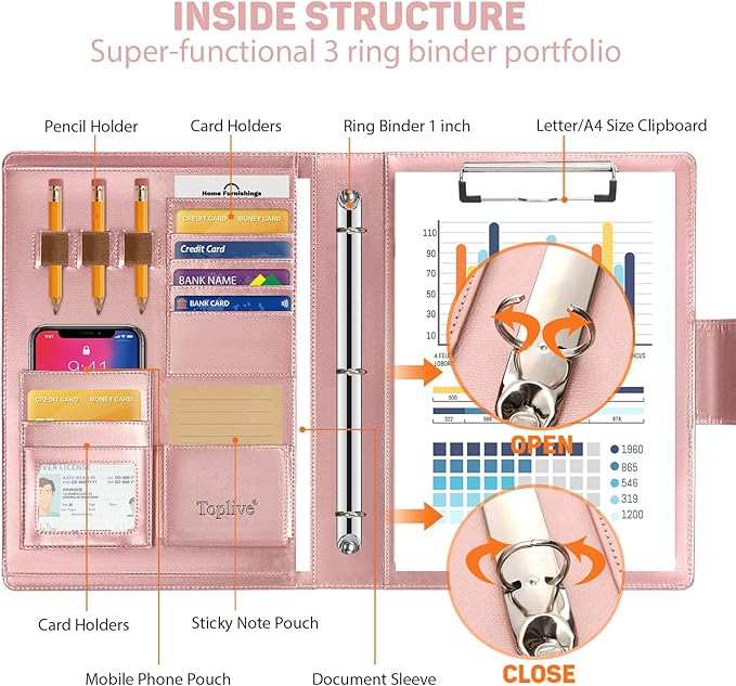 - Practical Structure: Toplive portfolio binder designed with 1 side document sleeve, 6 card holders, 3 elastic pen loop, 1 memo pad pouch ,1 cellphone holder, 1 clipboard and 1 metal 3 ring binder (1inch). Keep organized and professional during a business trip, an interview, a conference or presentation etc.