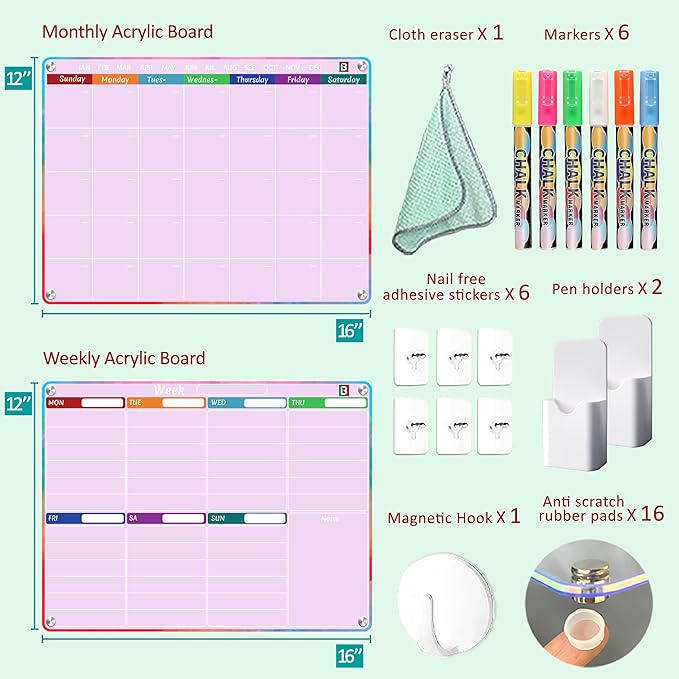 - ✳️【VALUE PACK | Ideal Gift】A complete set of Acrylic Calendars for Fridge includes | 1x Monthly Planner (12 x 16) in | 1x Weekly Planner (12 x 16) in | 6x Chalk Markers | 2x Magnetic Pen Holder (10 x 5) cm | 6 x Adhesive Wall Hooks | 2 x Cleaning Cloth | 1x Cloth Hanger | 16 x Anti Scratch Pads. Moreover, This Package comes in a beautiful white box, making it a versatile and practical gift for any occasion, ideal for enhancing productivity & goal achievement.