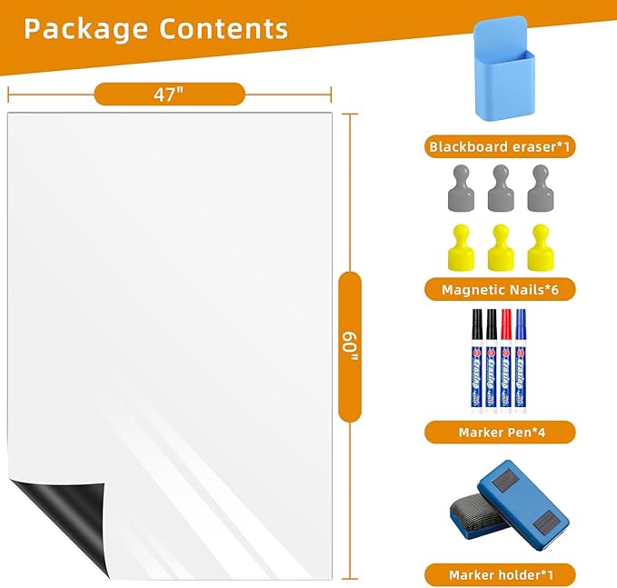 Dry Erase Adhesive Whiteboard Paper, 47" x 60" Stick on Magnetic Contact White Board Sticker on Wall for School, Office, Kitchen Fridge, Kids Drawing