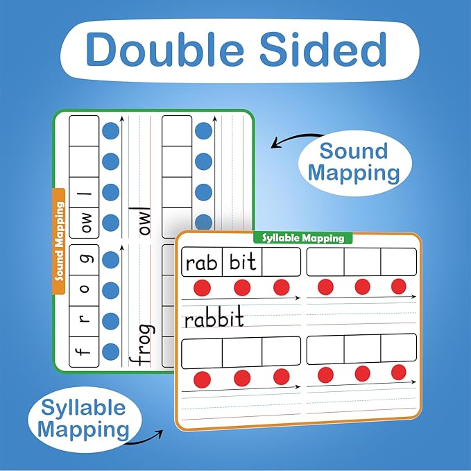 - 【12 Packs Sound & Syllable Mapping Dry Erase Card】Covering sound mapping on one side and syllable mapping on the other, this flash card feature boxes for segmenting words, dots to help children pronounce one syllable or phoneme at a time. Plus arrows that allow kids to blend the sounds or syllables together to say the words. This is a great educational teaching tool to help students to learn pronounce every syllable and sound of the word correctly.