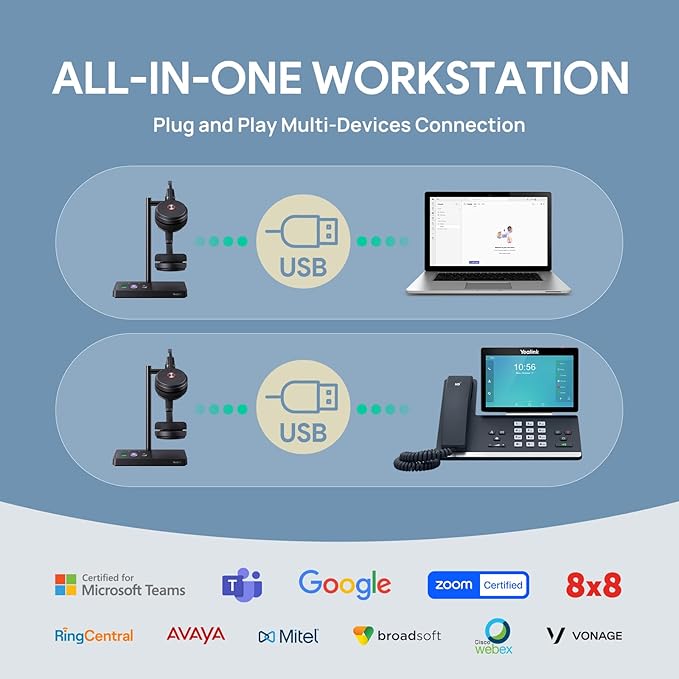 - Multi-Device Link: Wireless headset can connect to multi-devices, desk phones and computers via USB plug-and-play, and is compatible with many Yealink phones/third-party phones. The headset with mic is widely compatible with mainstream UC plf.