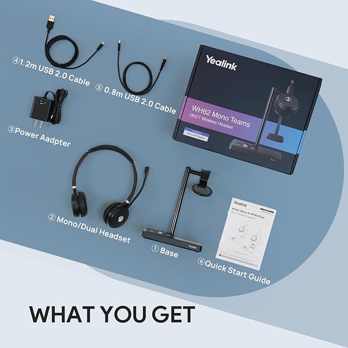 Yealink WH62 DECT Wireless Headset with DECT Base,525 Feet Range Teams/UC Zoom Certified Work Single ear Headset for Desk Phone and PC,Telephone Headset with Noise cancelling Mic,Ringer,13 H Talk Time