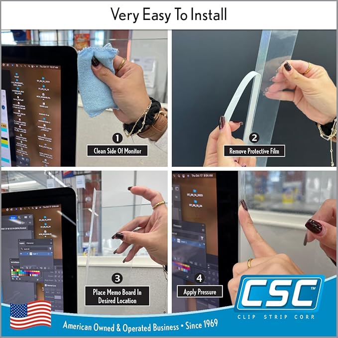 - APPLICATION - In order for the adhesive to work its best, before attaching the memo board, please wipe the surface down of the side of the computer frame with a cloth to remove any dust, dirt, or stray particles, and once the surface is dry, peel off the protective film strip and stick the memo message board onto the side of the actual computer frames - not to the computer screen itself. Apply firm pressure to the adhesive strip for 30 seconds to 1 minute. Place one on each side of your computer screen, and one or two on the top depending how wide your screen is.