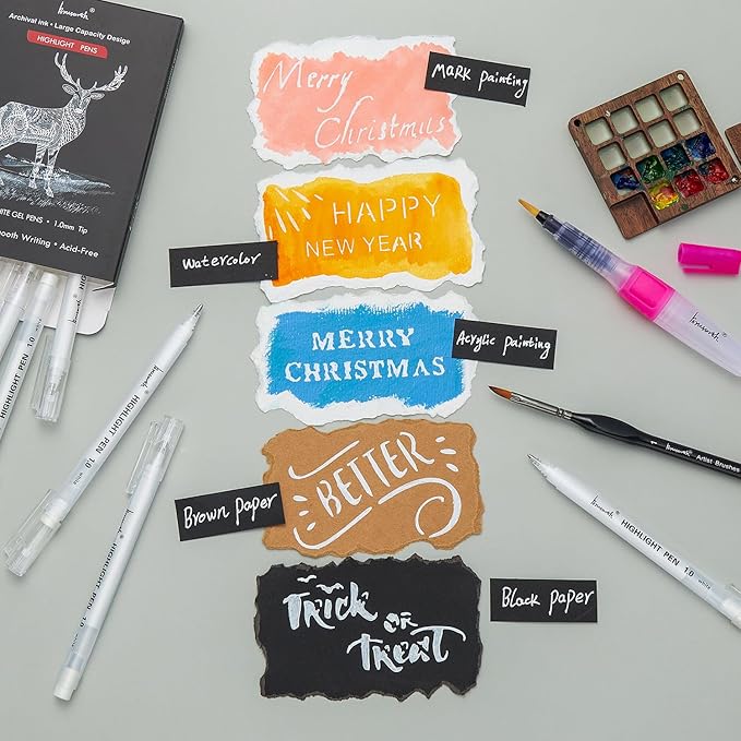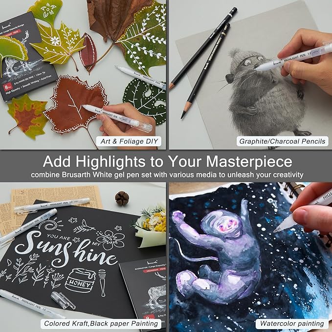 - PREMIUM QUALITY: Water-Based Gel Ink Pens, Fast drying, Acid free and Non toxic; Blends well with other media such as markers, watercolors, pens and pencils; You can use it for the white high-light part of the mark pen works, like white light,stars