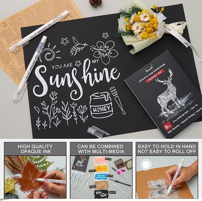- FINE POINT WHITE GEL PENS: 1.0mm White Gel Pens pens to add shines, glares, snow, highlights and more to your compositions, Create Boldly on Any Colour of Paper - The white ink dries quickly and opaque so your designs, writing or sketches will look bold on dark surface