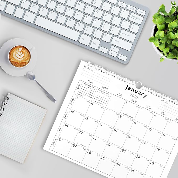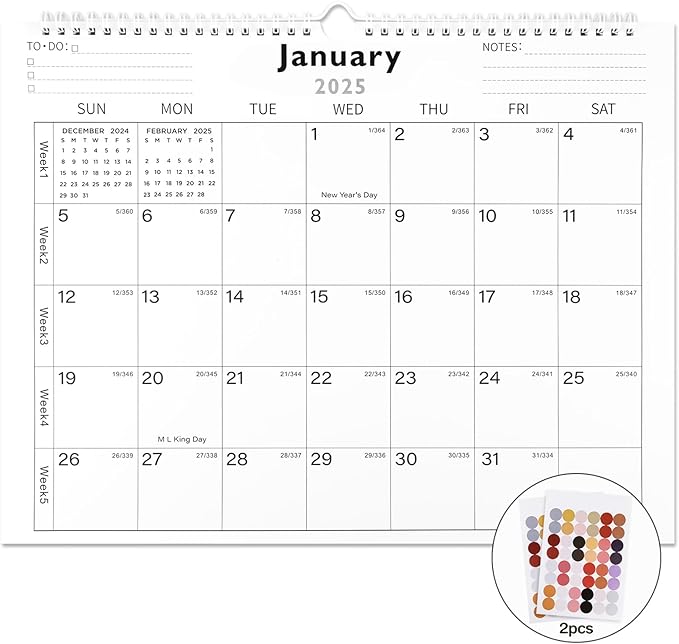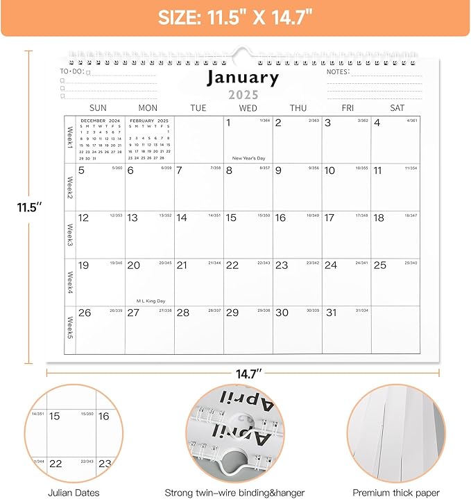 - MONTHLY OVERVIEW: This 2025-2026 wall calendar's monthly overview pages include past and future monthly references, highlighted federal holidays, which help remind you of important holidays and manage your life effectively. Each month's page is numbered with a week, which helps to clearly organize each week of the year, with Julian dates on the grid that can also be used for long-term planning.