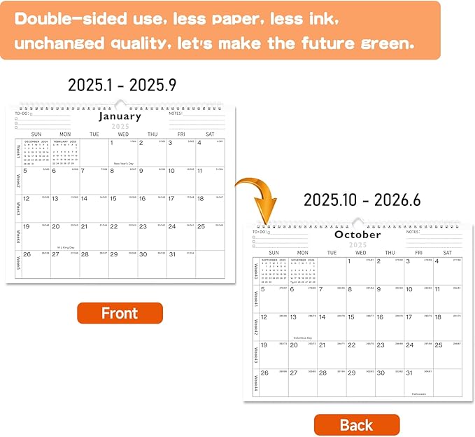 - SIMPLE AND ECO-FRIENDLY DESIGN: 2025-2026 wall calendar uses 9 sheets of double-sided printing design totaling 18 pages, which is more environmentally friendly. Let's make the future green. With generous grid space, each grid is 1.85"*1.78", there is enough writing space for daily life planning.