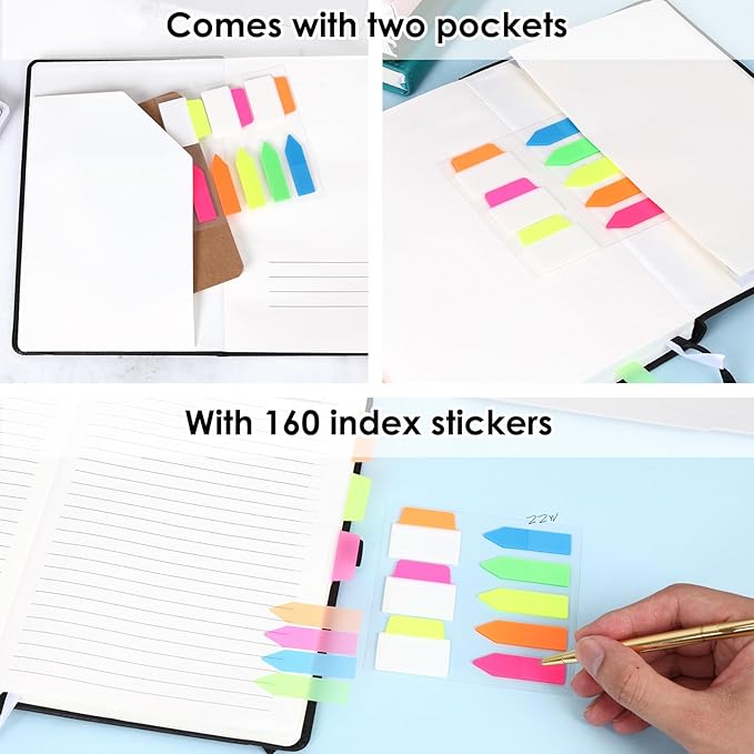 - Value of Money:This leather notebook with150sheets/300pages has 1 pen holder, 2 ribbon bookmarks, one paper pocket on the open cover, one expanding pocket on the back cover, and an extra 160 index stickers to meet your needs.