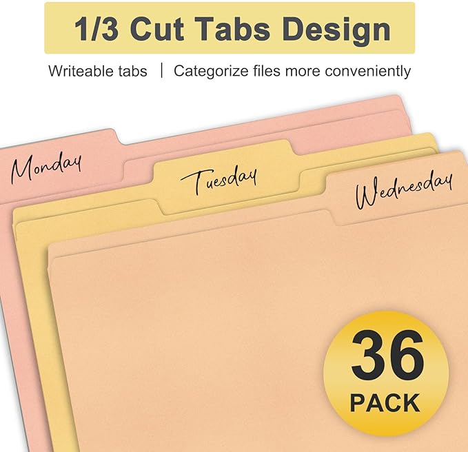 - Letter Size Paper:Streamline your organization with our pack of 36 high-quality, recyclable file folders. Each folder features 1/3-Cut Tabs for easy labeling and categorization.The construction is designed to hold 8.5×11 inch papers securely, ensuring your documents stay in order.