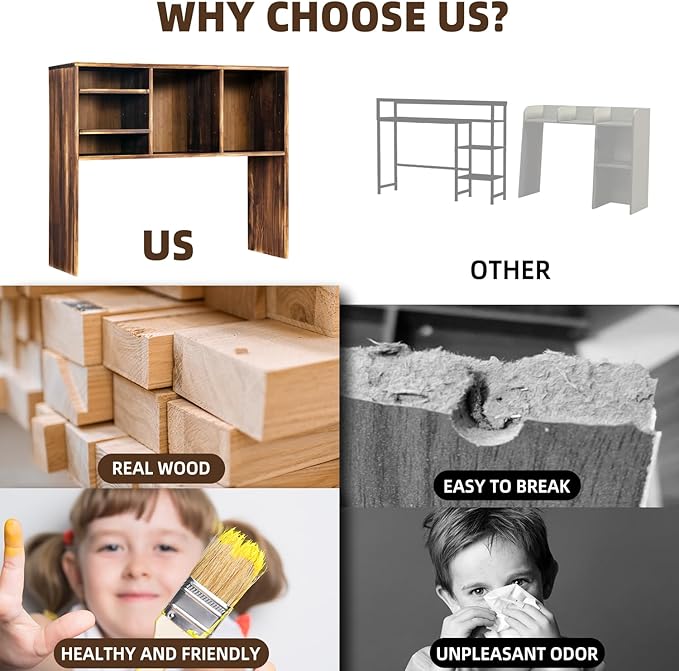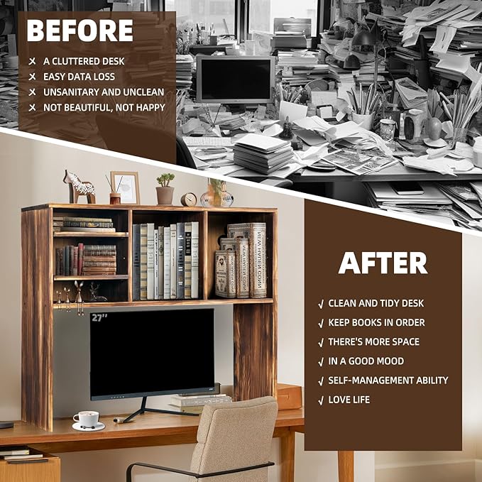 - 【Large capacity】 : can accommodate 27 inch display. Vertical storage space to organize the desktop and maximize the use of space, the desktop bookcase provides you with 3 upper shelves and 2 dividers that can adjust the storage space to accommodate books, ornaments, calendars, plants and other debris