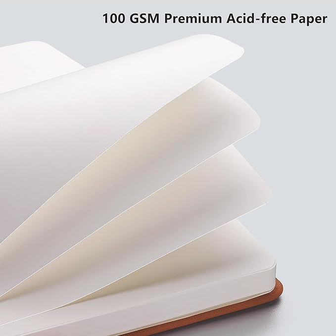 - BLANK JOURNAL NOTEBOOK: RETTACY Blank Notebook comes in A5 (5.7'' × 8.3'') size, 96 Sheets/192 Pages, durable and smooth Leather Hardcover, 100 GSM Thick Acid-free Paper, Elastic Closure Band, Pen Holder, 2 Ribbon Bookmarks, Inner Pocket, Drawing Stencils