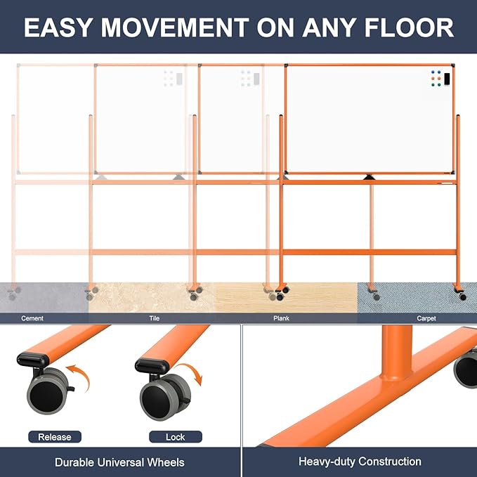 - DOUBLE-SIDED DESIGN - The double-sided whiteboard gives you plenty of writing space, while the board stopper ensures that the mobile whiteboard stays firmly in place during use, preventing it from moving or wobbling.
