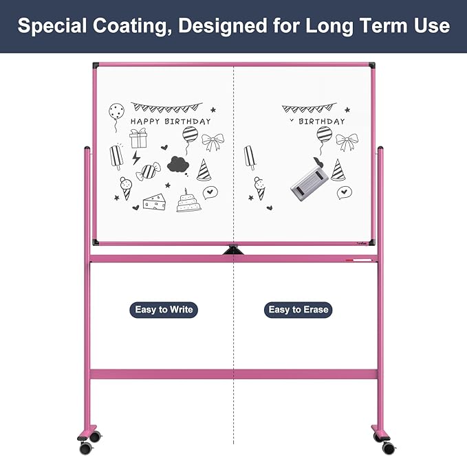 - DOUBLE-SIDED DESIGN - The double-sided whiteboard gives you plenty of writing space, while the board stopper ensures that the mobile whiteboard stays firmly in place during use, preventing it from moving or wobbling.
