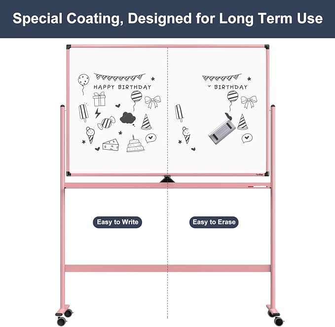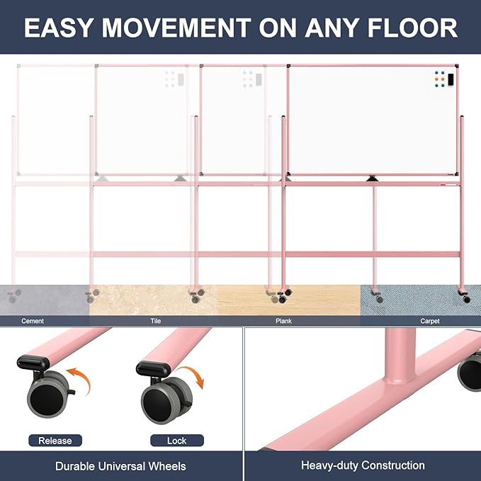- DOUBLE-SIDED DESIGN - The double-sided whiteboard gives you plenty of writing space, while the board stopper ensures that the mobile whiteboard stays firmly in place during use, preventing it from moving or wobbling.