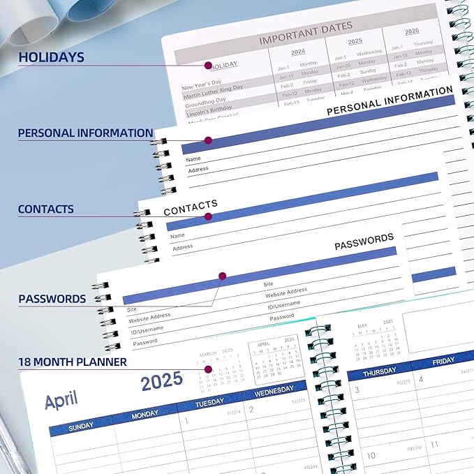 - Calendar Planner 2025-2026 - 7.6 " x 10.2" large planner covers 18 months from January 2025 to June 2026, Also features with important contact page, password page, personal information page and notes page.