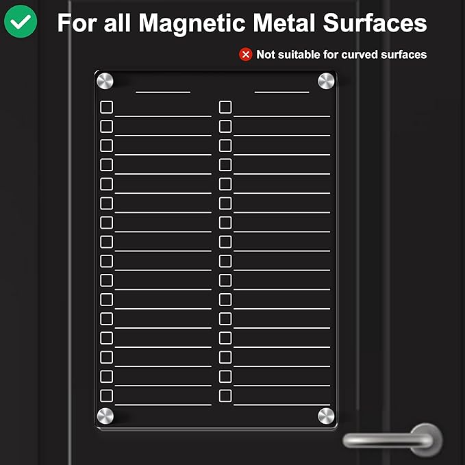- [Easy to Mount on All Magnetic Surfaces] Clear list boards can be firmly attached to the refrigerator or various metal surfaces, with very strong grip. Some Warm Tips: 1. Please test whether the refrigerator is magnetic before purchasing. 2. Small Magnetic Dry Erase Board is not suitable for curved refrigerator door.