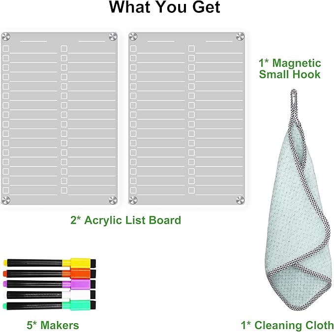 - [Multi-Purpose Fridge Whiteboard Magnetic] This 12"x8" Fridge to do list can be used as a shopping list, grocery list, bill due, menu, separate notes board, it's up to you! This acrylic fridge dry erase board is an easy, handy tool to keep your daily life organized like you've never before. We also provide 5 wet erase markers with bright colors and 1 cleaning cloth.