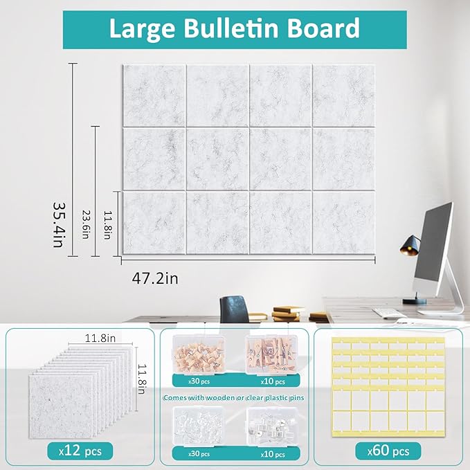 Large Cork Board for Walls - 12 Pack Felt Wall Tiles with Safe Removable Adhesive Tabs - 48" x 36" Bulletin Board for Office & School & Home Decor - Marble White