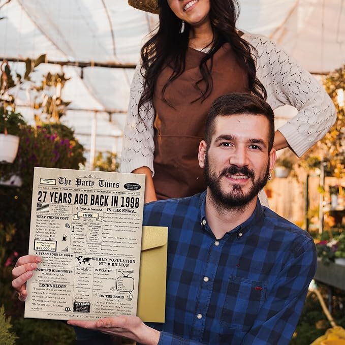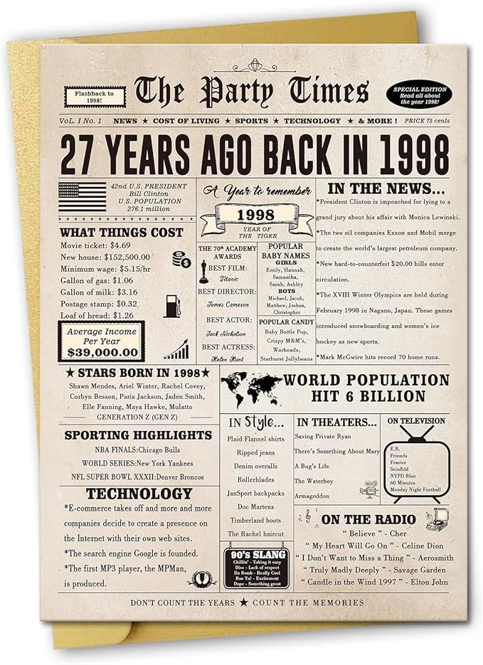 - This large 27th birthday card features a vintage newspaper design, showcasing important events, movies and sports events from 27 years ago.