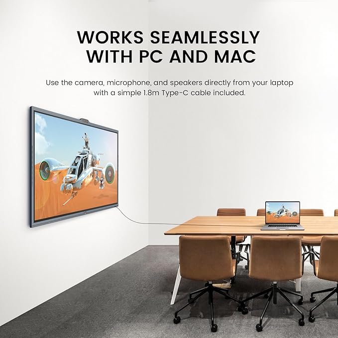 - Seamless Compatibility with PC and Mac:The whiteboard features a front-facing Type-C interface for easy casting and management of your devices. Use the camera, microphone, and speakers directly from your laptop with a simple 1.8m Type-C cable included. Enjoy seamless wired screen-sharing and BYOD (Bring Your Own Device) flexibility