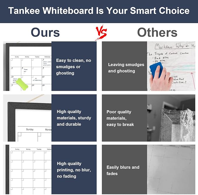 - QUALITY CALENDAR WHITEBOARD - This dry erase board is made of high quality materials, the wooden frame is sturdy, easy to write and erase, the lines won't fade, and is designed for long-term use.
