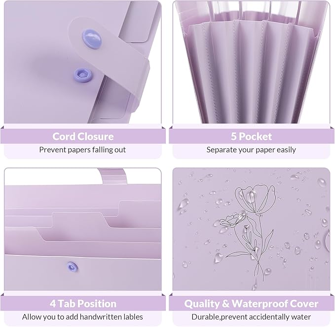 SKYDUE Expanding File Organizer with 5 Pockets, Accordion File Folders with Labels, Portable Document Paper Bill Receipt Organizer, Home College School Office Supplies, Letter Size, Lilac