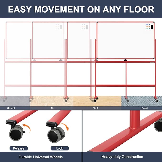 - DOUBLE-SIDED DESIGN - The double-sided whiteboard gives you plenty of writing space, while the board stopper ensures that the mobile whiteboard stays firmly in place during use, preventing it from moving or wobbling.
