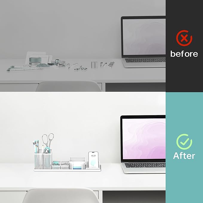 - High-capacity Design Pen holder - Desktop Organizer includes 6 compartments that keep pens, pencils, markers, sticky notes, paperclips, and more office supplies to help to get work done faster! Pencil holder is a great tool for keeping your desktop neat and tidy, stay away from mess!