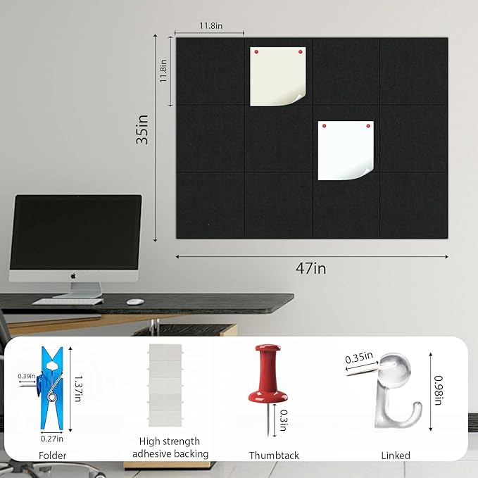 - Complete Organization System:This premium set includes everything you need: 12 heavy-duty felt panels (48"x36" each), 60 rust-proof push pins in 8 colors, 10 sturdy clips for documents, and 10 versatile hooks for keys or decor. Create a 12 sq. ft command center that goes beyond basic cork boards.