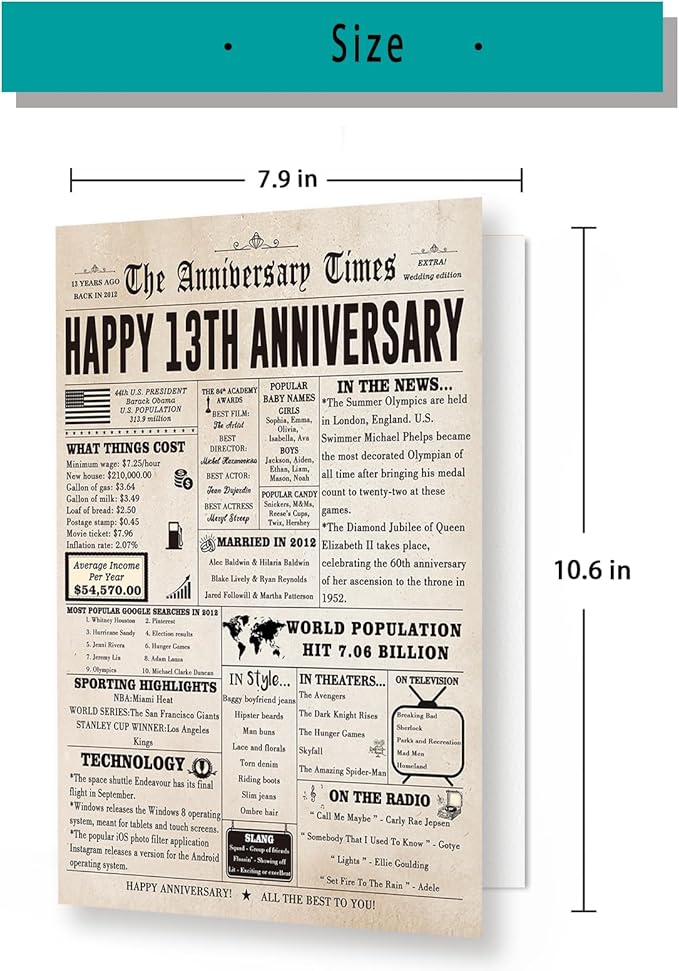 - Product Introduction: This happy 13th anniversary decorations features a single sided retro card design, rich and colorful content, with many interesting stories about the year of birth.