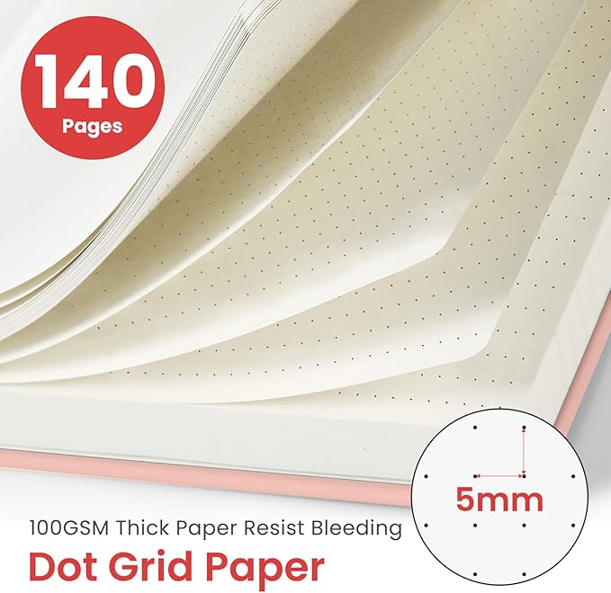 - Premium Dotted Pages: Featuring 100 GSM thick, bleed-resistant paper, the dot grid layout allows precision and flexibility for journaling, sketching, bullet journaling, or drafting designs. It accommodates various pen types, including gel and fountain pens.