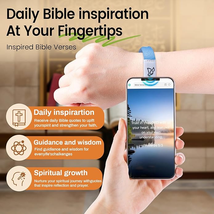 • INNOVATIVE DESIGN: Daily bible verse bracelet is made of high quality polyester elastic material, the bracelet can be used to access Bible verses anytime and anywhere via NFC, the elastic process can be adjusted to fit comfortably, it is waterproof, sweatproof and washable