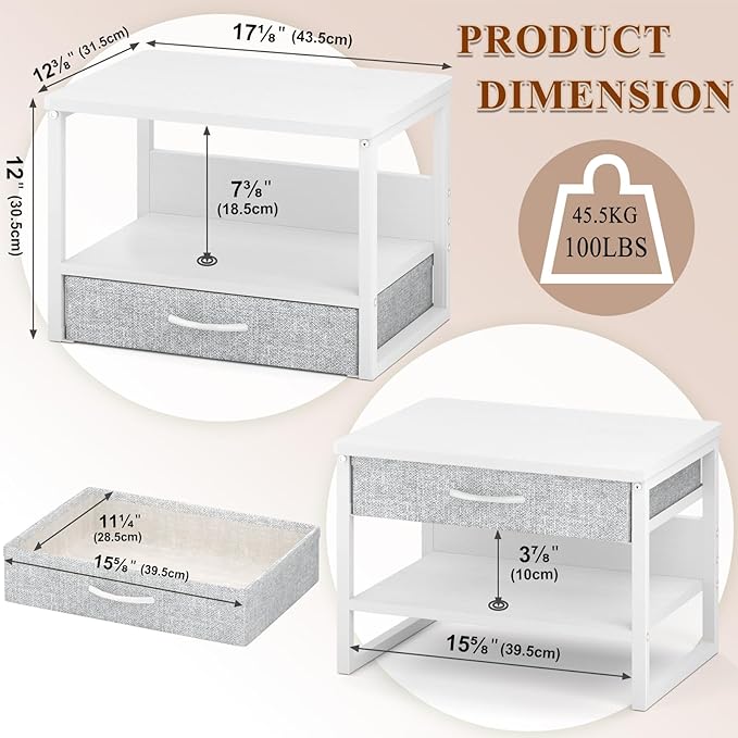 - 【Large Capacity & Space Saver】Dimensions: 12.4"D x 17.1"W x 12"H. This small printer table provide 2 open storage shelves and a fabric drawer for more storage space. Create an organized and efficient work environment.