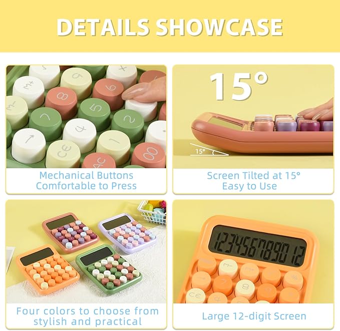 - Calculator Design: The mechanical-like button design provides a comfortable feel and is easy to press accurately. The 12-digit digital display with a 15° tilt design provides optimal viewing angle and stability