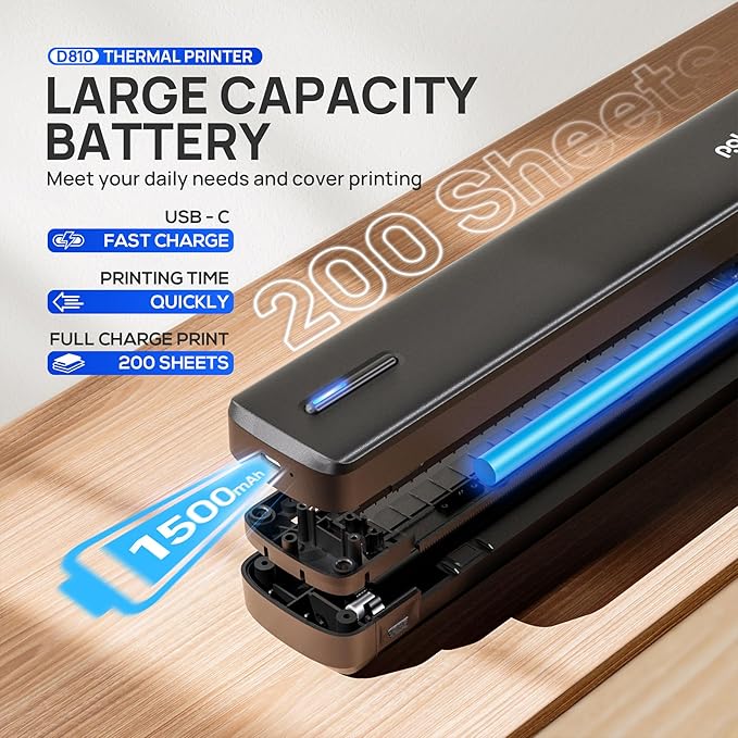 - 【Clear Printing】POLONO D810 Portable Printer uses high-definition printing technology, providing you with clear printing. D810 inkless wireless can work for about 49 minutes and print about 200 sheets of thermal paper when fully charged. This tattoo printer compatible with both roll paper,fan-fold paper and tattoo transfer paper, support printing PDF, Word, Images, Web from your phone—whenever, wherever. We recommend using our POLONO thermal paper for good printing quality.