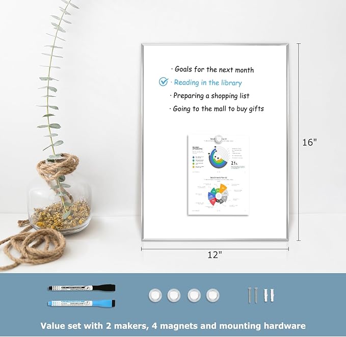 Small Whiteboard, 16'' x 12'' Magnetic White Board Dry Erase Board for Wall, Hanging Silver Aluminum Frame Wipe Board for Home, Office, School