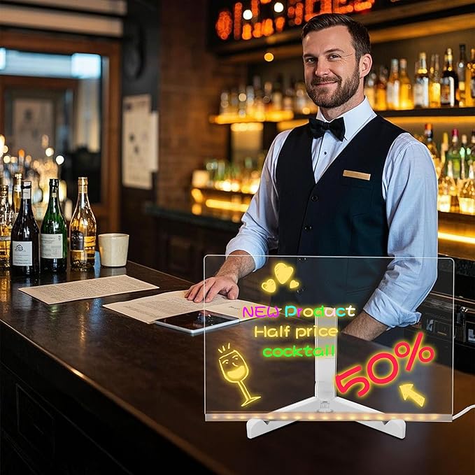 - Multiple Uses: As an LED note board with colors, write down your work and study plan, holiday schedules or to-do list to prevent missing out. As a LED note board to leave notes for your family, colleagues, friends, its featured design ensures your message will be noticed quickly. As an LED writing board for bar counters, hotel front desks and restaurant front desks. Display today's menu, new products and recent offers with glowing writing fonts to make your front desk more distinctive
