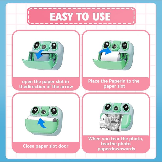 - ๐๐๐ฌ๐ฒ ๐ญ๐จ ๐๐ฌ๐: Our kids camera instant print paper is very simple to install, and kids can also easily change the camera paper by themselves. Just let the kids put the thermal paper roll in the correct direction.and you can take it with you to various places to take pictures so that kids can record beautiful moments at any time