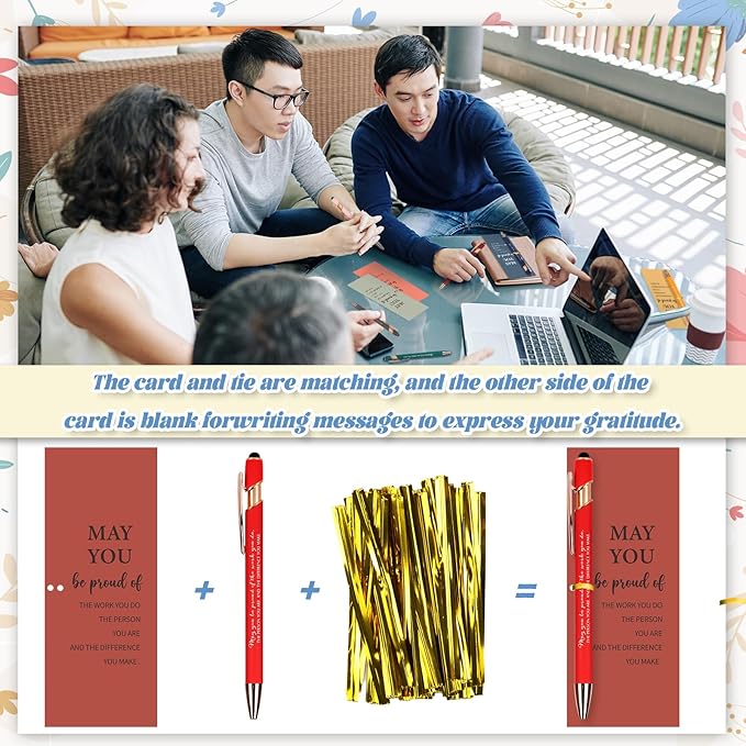 - Package Includes:: You will receice 30 employee appreciation pens in 10 different styles, printed with motivational messages; in addition to the pens, there are also 20 elegant colored employee appreciation cards and 1 bag of gold twist ties, which are convenient for fixing cards and pens