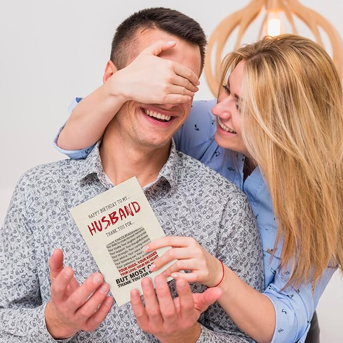 - 【QUALITY MATERIAL】Crafted on 300gsm recycled smooth cardstock (7.9”x5.4”), Comes with a red envelope and protective plastic sleeve to avoid damaging the card, Perfect for mailing or putting in a surprise gift box for your husband's unique birthday gift!