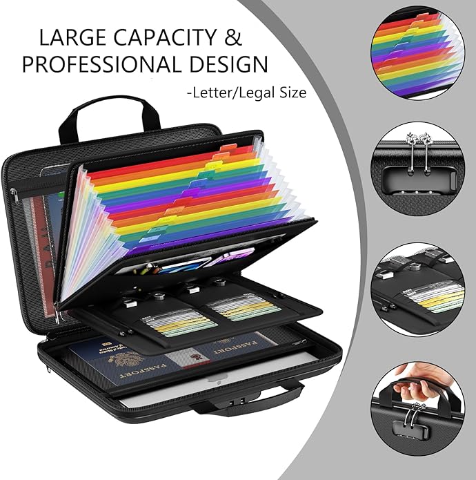 - 【Multi Pockets Fireproof File Organizer】:Outside size :15.5x11.8x3 inches(Full load size : 14.2 x 10.4 x 4 inches ).Multifunctional sorting folders for your business needs. There's an extra 13-page organ folder. Our unique design allows you to neatly store and classify laptop; legal/letter files;receipts;cards;USB drives;pens;passports and more. This would be an ideal gift for family or friends